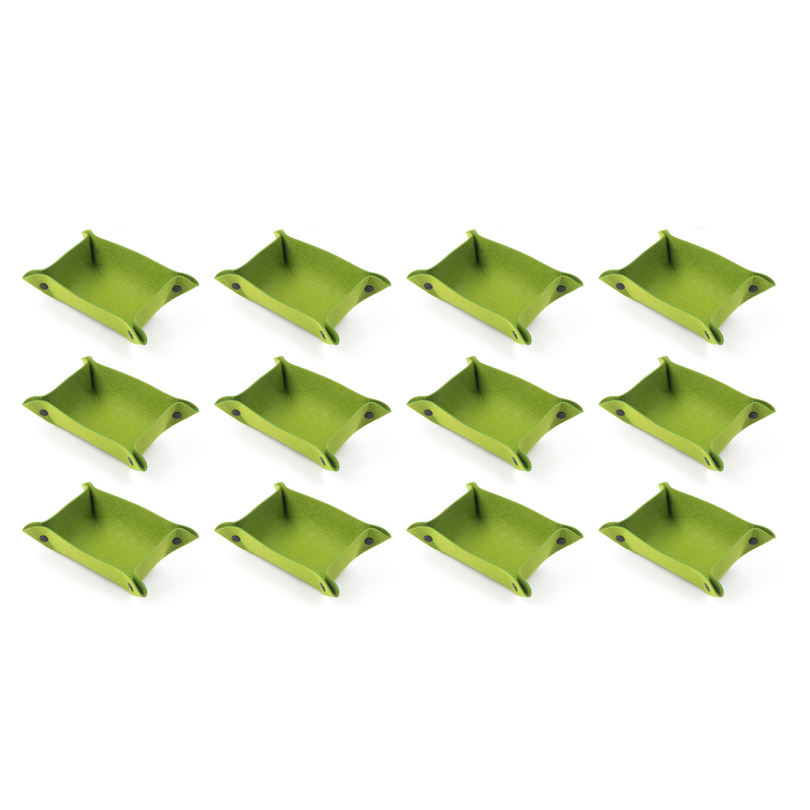 Sind die in der Ecke der Filzschale eingestanzten Druckknöpfe geschlossen, dann haben wir einen leuchtend grünen Korb, der den Inhalt frisch zur Geltung bringt und Freude macht. Oder die gesammelten Murmeln und Fundsachen aufbewahrt. Sind die Druckknöpfe alle offen, haben wir eine Unterlage, die für die unterschiedlichsten Anlässe nutzbar ist. Zum schallarmen Würfeln, zum Tisch schonenden abstellen von Gefäßen, auch mal zum Sitzen im Freien. Schließt man nur eine Seite, könnte man eine kleine Kugelbahn, einen Trichter und viele andere spontane Helfer für den Alltag kreieren. Ganz flach kann die Filzschale platzsparend aufgeräumt werden, um immer wieder zum Einsatz zu kommen.
