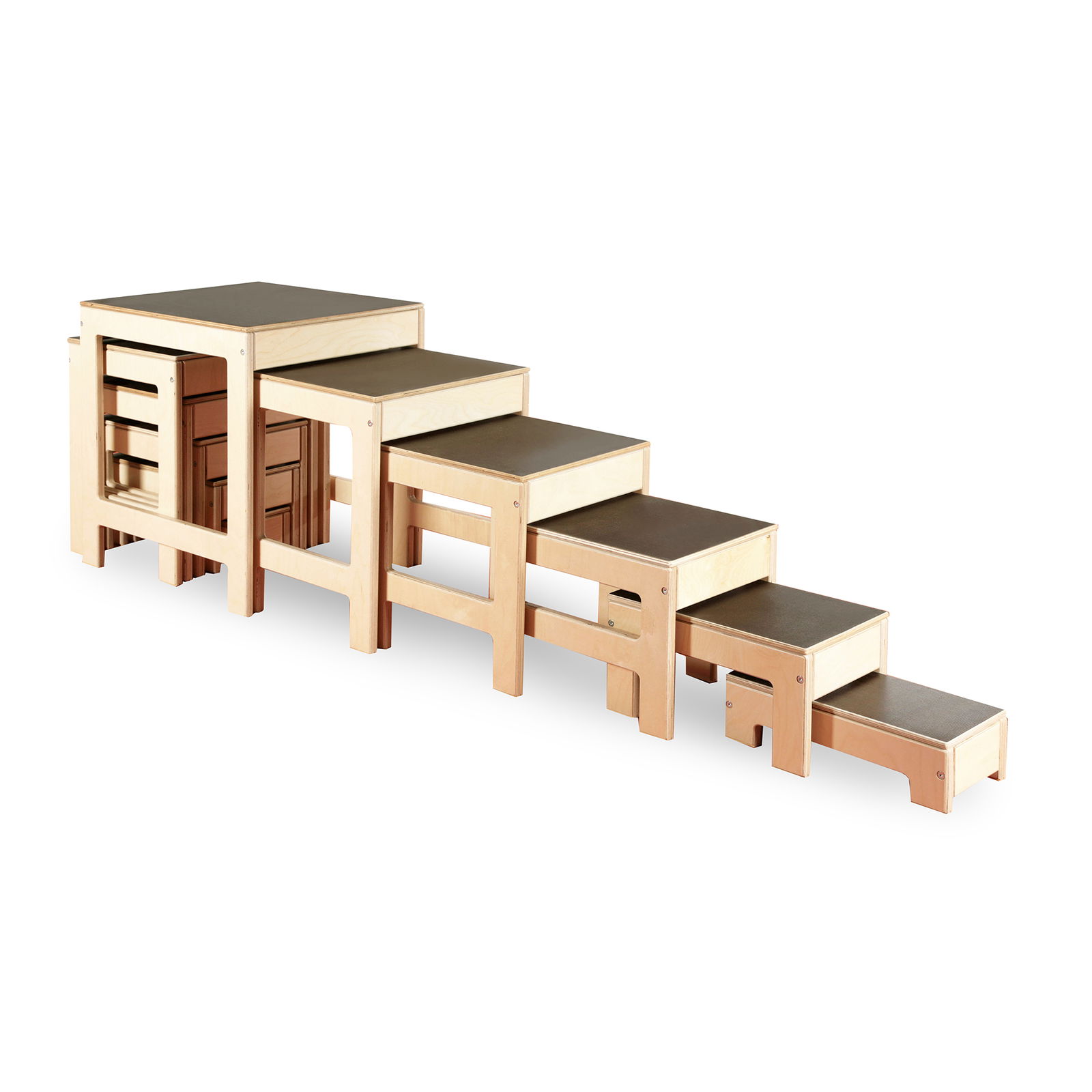 Hockertreppe ausgezogen: 5 m Maße größter Hocker: 65 x 55 x 70 cm Maße kleinster Hocker: 45 x 20 x 15 cm