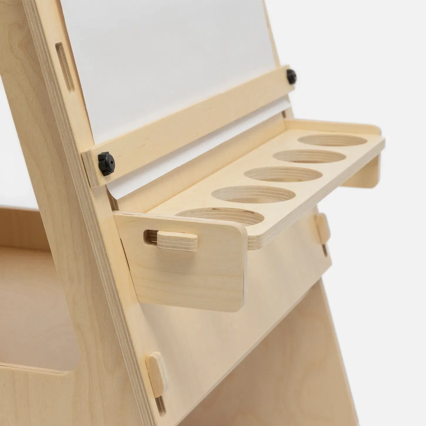 Unsere Staffelei ist für Kinder, Jugendliche und Erwachsene ausgelegt. Sie ist einfach der Körpergröße anzupassen. Dafür wird die Malfläche aus der stabilen Halterung genommen und in eine höher- oder tieferliegende Halterung gelegt.