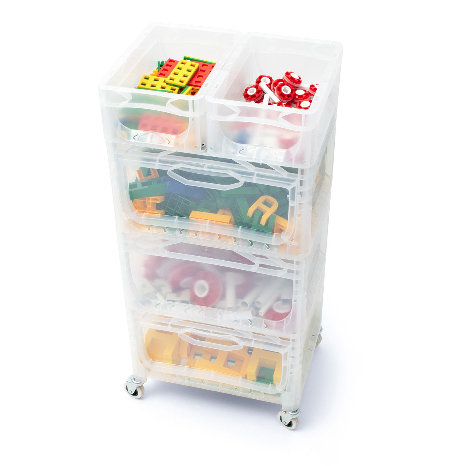 Du hast mit dem transparenten Rollwagen immer den Überblick. Die Bauteile sind für die Kinder leicht zu finden, da sie einfach von außen erkennen, wo sich die passenden Klemmbausteine befinden. Dadurch entsteht weniger Unordnung und den Kindern fällt es leichter im Spielflow zu bleiben. Außerdem kannst Du Deine K-TEC Grundausstattung so kinderleicht und rückenschonend von Raum zu Raum gleiten lassen.