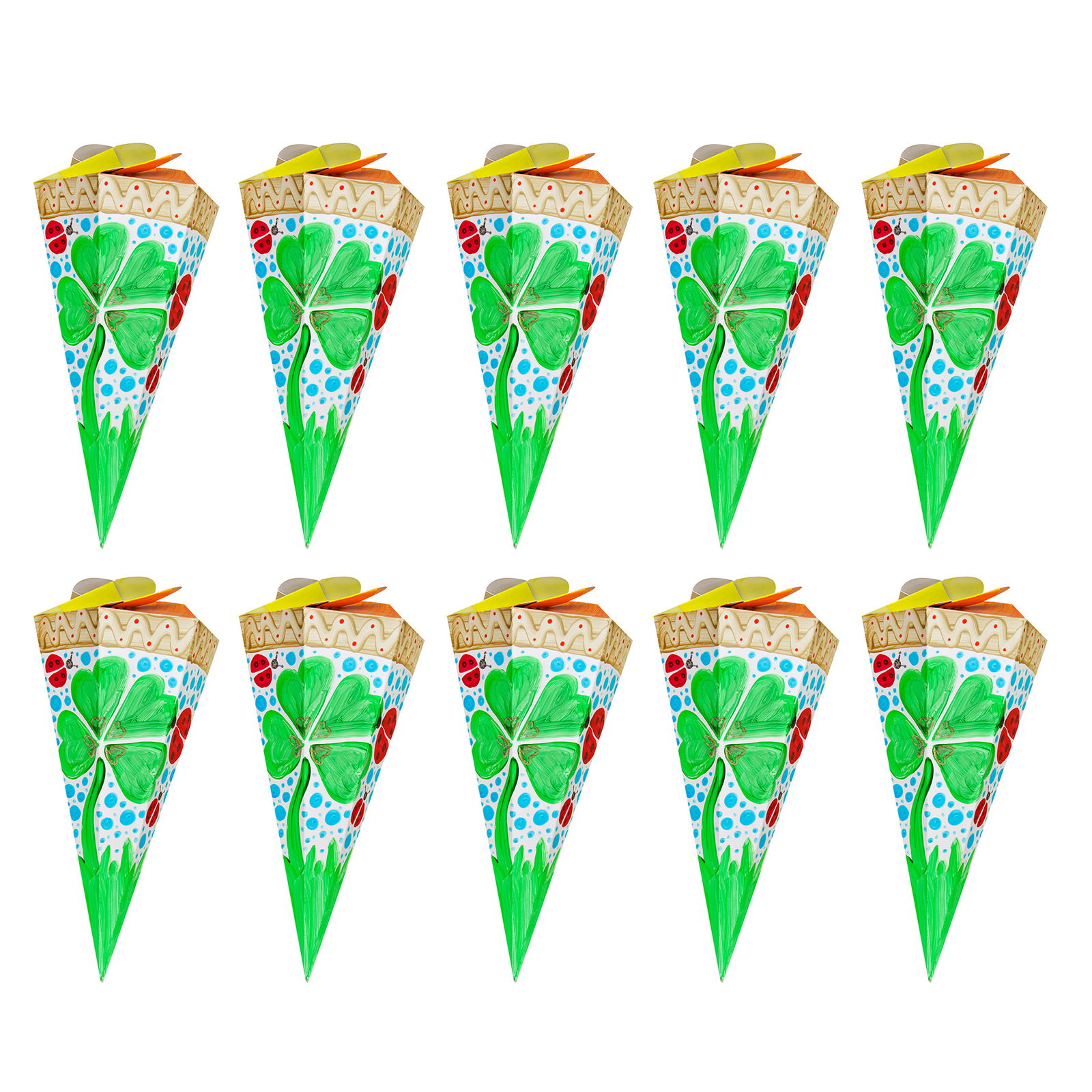 Schultüte gir tilstrekkelig stabilitet takket være en papirtykkelse på 350 g/m², og er likevel lett å sette sammen. Brett langs den pregete linjen og stikk inn i de tiltenkte åpningene.