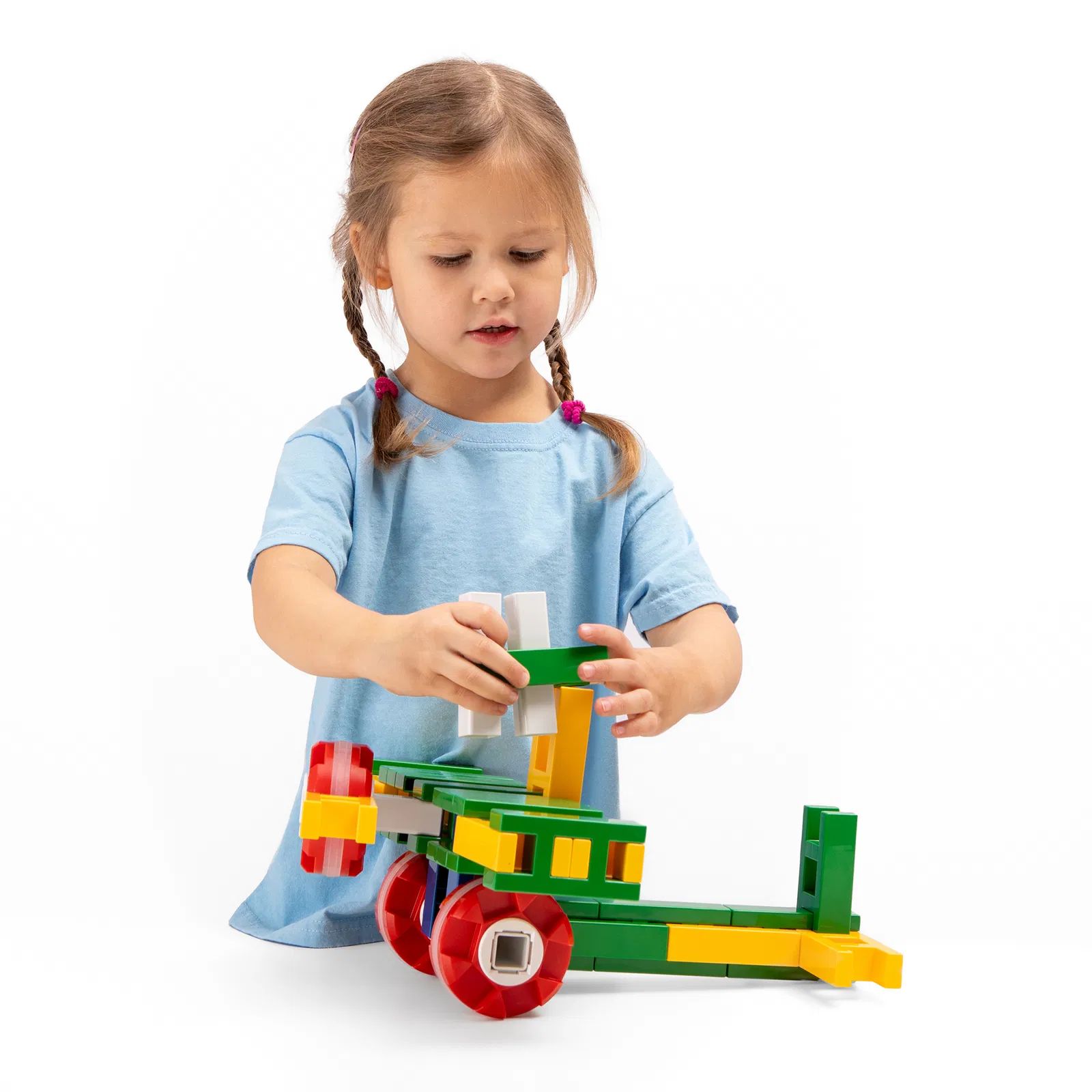Abgestimmte Sets ermöglichen altersgerechtes Konstruieren – vom ersten Bauen des Kleinkinds bis zum greifbaren Verständnis mechanischer Funktionen im Schulalter. Geniale Set, die Du erweitern & miteinander verbinden kannst.