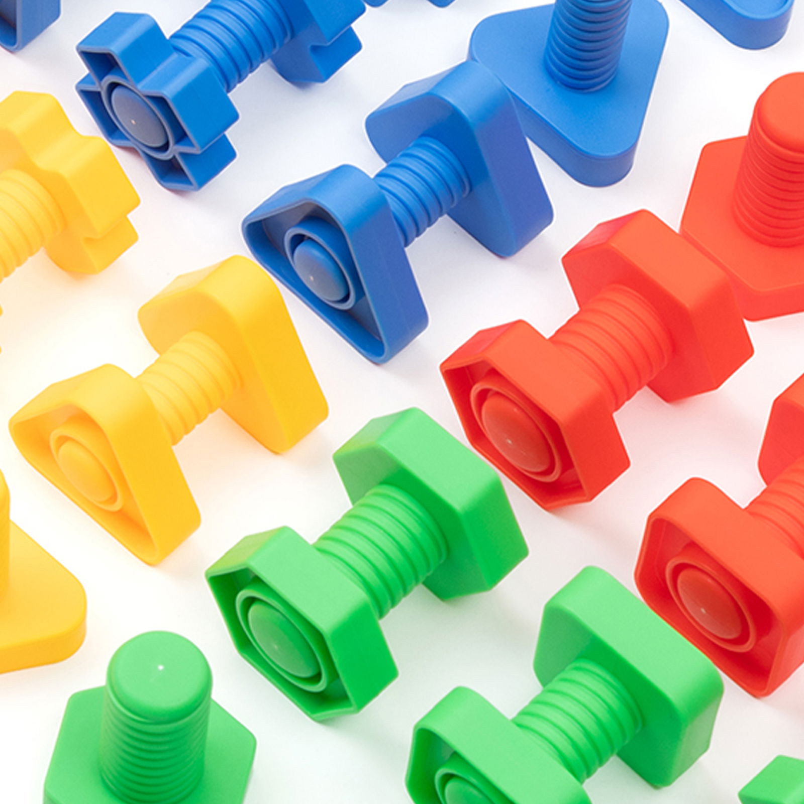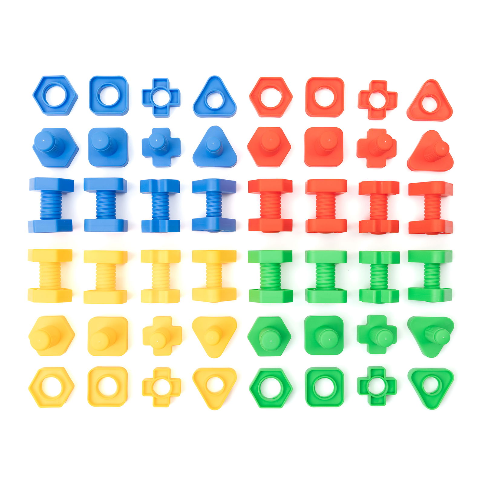 - 64 parafusos e porcas em formas geométricas: triângulo, quadrado, hexágono e cruz