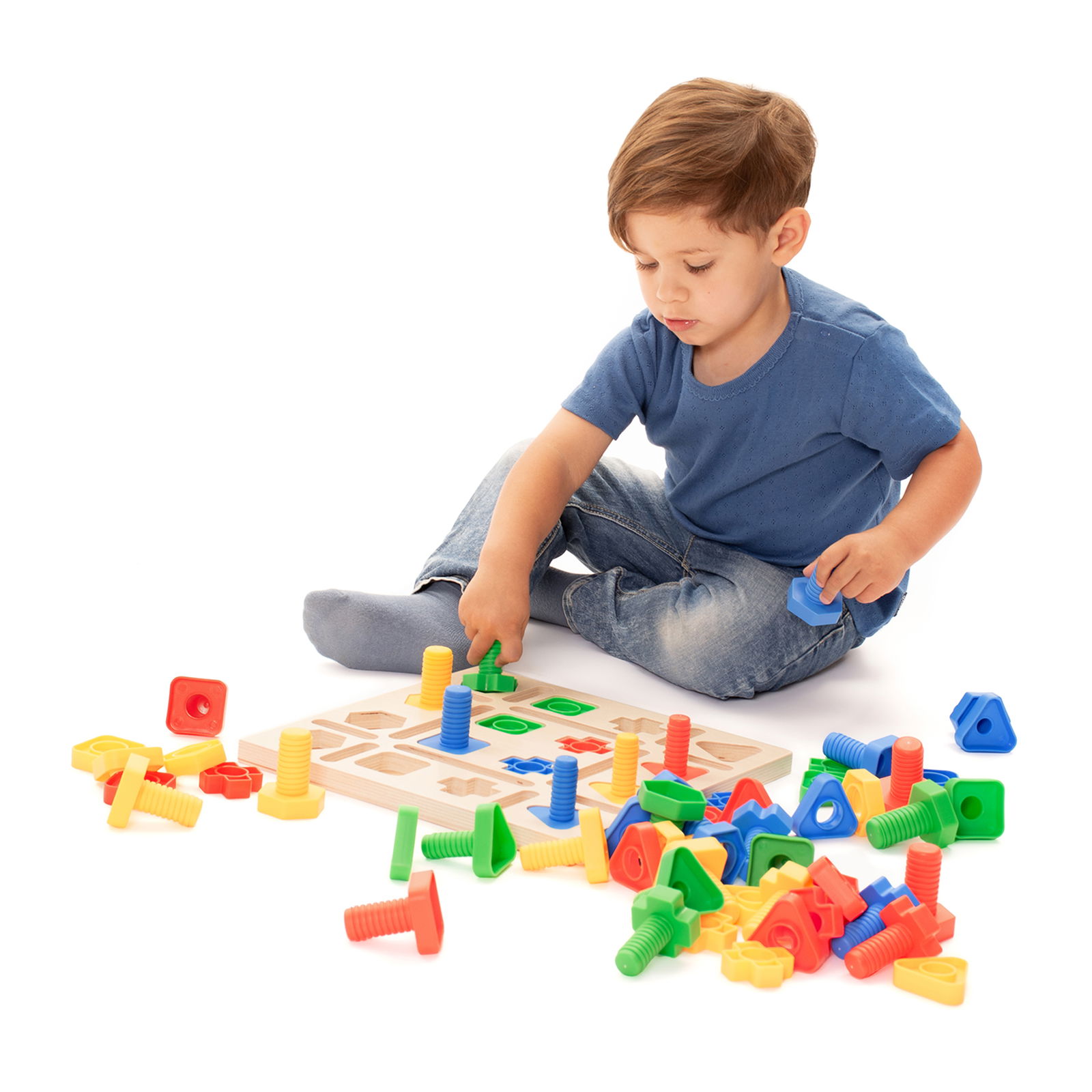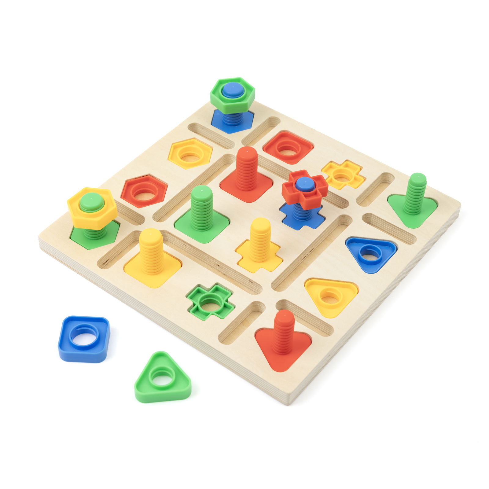 64 parafusos e porcas em formas geométricas: triângulo, quadrado, hexágono e cruz, tabuleiro de madeira, pasta educativa, saco de algodão