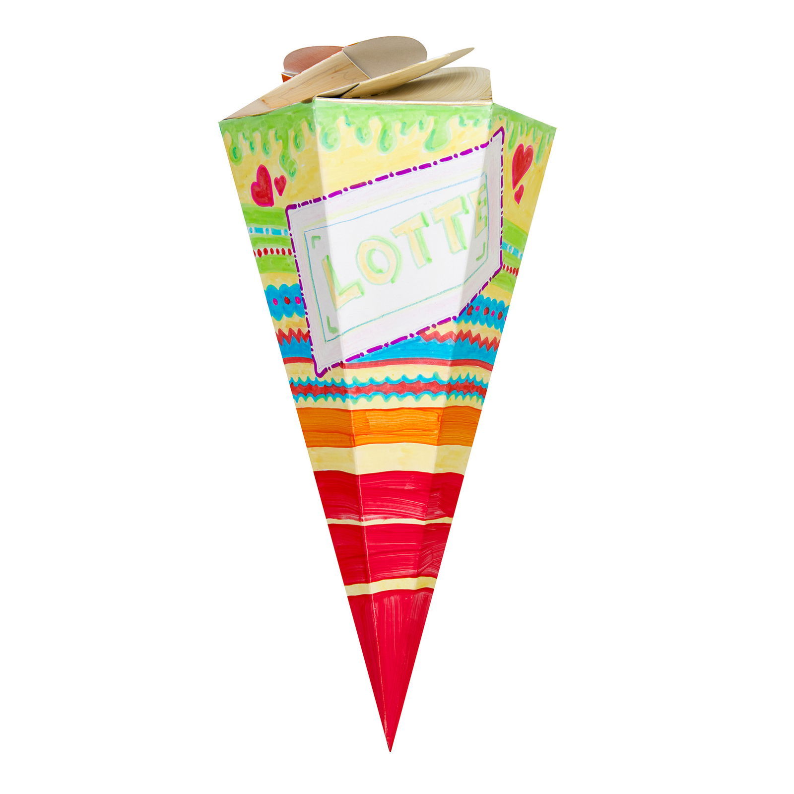 Die bunte Schultüte überzeugt mit strahlenden Farben und verspieltem, lockeren Design. Wem der befüllte Schatz wohl gehört? Einfach den Namen des künftigen Schulkinds in das vorgesehene Kästchen schreiben und schon wird klar: Diese süße Überraschung ist für Dich.