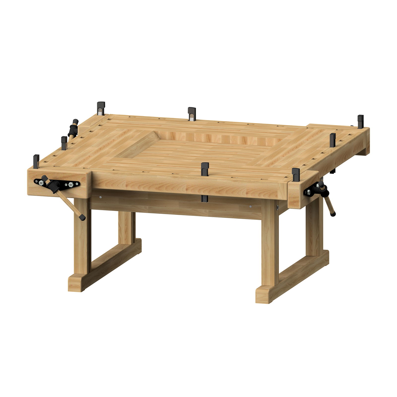 - Für vier Arbeitsplätze mit einem Plattenmaß von 130 x 130 x 9 cm, Buche-Massiv-Platte: längsseits riegelartig zahnverleimt & gewachste Oberfläche